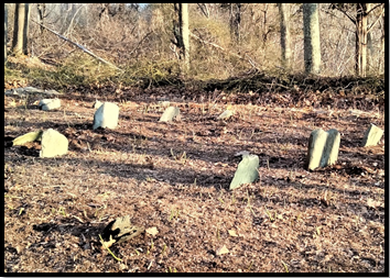 The cemetery is roughly 90 feet long by 60 feet wide and contains over 40 burials. The graves date from 1836-1927. They are marked by both headstones and footstones. All markers are uninscribed fieldstones.