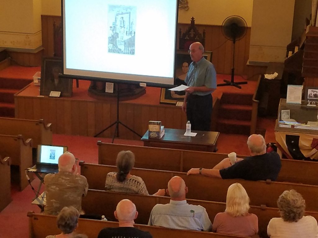 In the Audience Room upstairs, Richard Schmidt portrayed Temperance preacher John B. Gough who traveled through the area with his rallies. Maria Schmidt will portray the wife of a reformed drinker who lauds Gough’s efforts. This room was actually used for Temperance speeches, so we will be having a Temperance rally with songs, signing the pledge, etc. We stepped back in time to the 1870s.