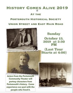 Oct 13 – 2:30 – 4 PM “History Comes Alive” (at the Historical Society). Last day of museum opening for the season.