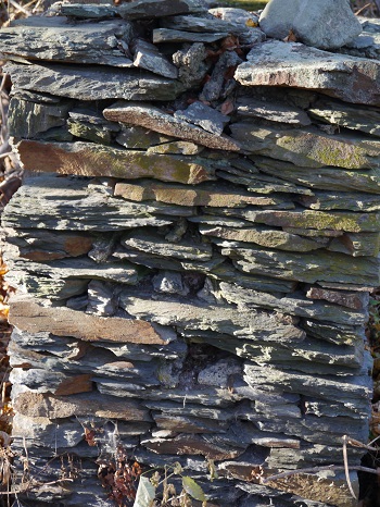Our walls look different from the walls in the communities off the island. The fieldstone that make up our walls are flatter. That makes them easier to work with when a wall is put together. Our slate, for example, is layered and can be split into slabs. Slab type stones make the best walls.