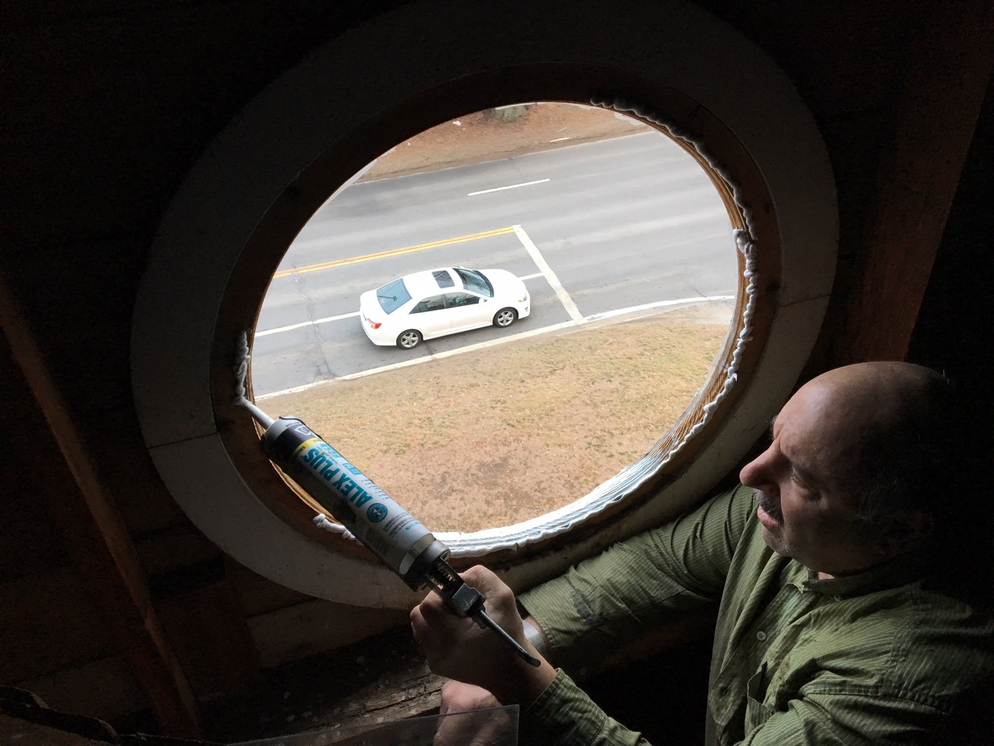 The eagle eye of Gary Gump and the great work of Mike Paglierani and Dave Duggan averted potential damage to the PHS Building. On Friday, Feb 23, Gary Gump, passing by, noted that the upper round window on the front of the building was missing. Rich Talipsky, Dave Duggan and Mike Paglierani located the plexiglass window and surveyed the window status in the attic. Mike and Dave took quick action to repair the window, averting intrusion of weather and aviary creatures to the building. Nice work guys!!!!