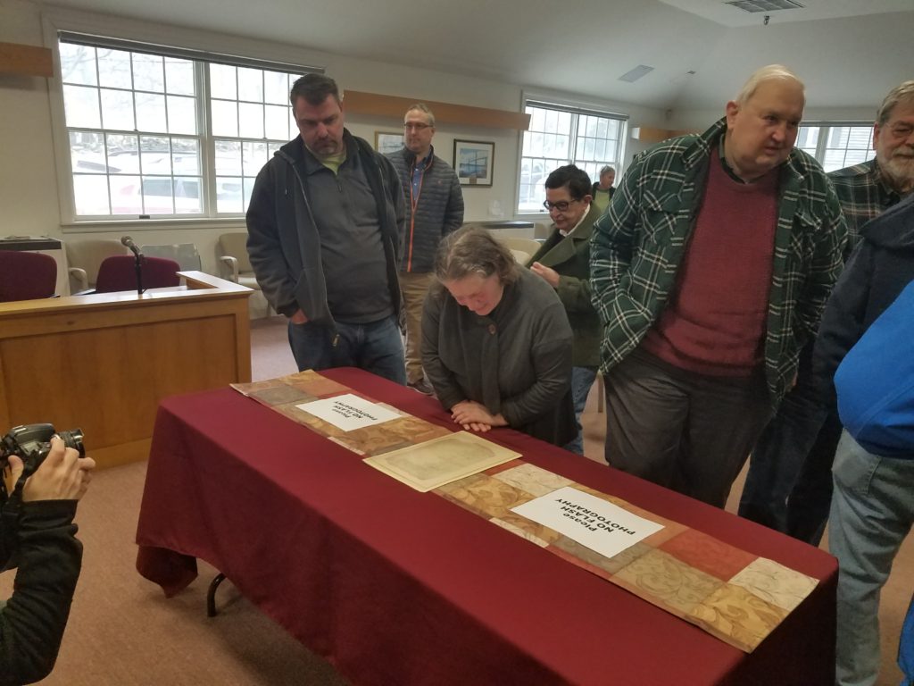The Portsmouth Historical Society arranged a public viewing of the original 1638 Portsmouth Compact with the RI State Archives. they do this each year in March to commemorate its signing. An archivist with State Police escort carried this 383 year old precious document, one of the oldest and most important documents in the state archives, to and from the Portsmouth Town Hall where citizens were able to view the document. Town Historian Jim Garman gave a brief talk on the compact and the founding of Portsmouth. . Also on display was the Town of Portsmouth’s Declaration of Independence, which is believed to be the only Rhode Island copy that has remained at its intended destination – at a town clerk’s office or in a town hall. The Town of Portsmouth, RI has one of eight copies known to exist of the approximately 36 Declarations printed for the Rhode Island Assembly by Newport printer Solomon Southwick on July 13, 1776. Those Declarations were then distributed to each city and town clerk in Rhode Island to be read to the public or posted for the public to view.