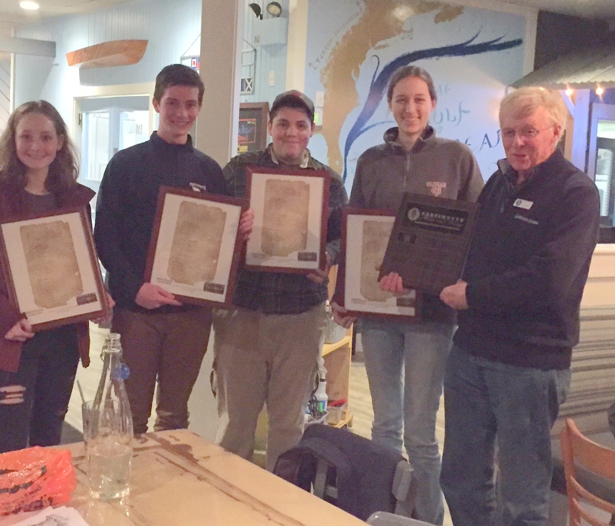At the end of the evening, Jim Garman presented the winning team with a framed copy of the Portsmouth Compact of 1638. Organizer and Society Vice President, Doug Smith, thought the evening was a great success. “Any time you can get our school kids to focus on our local history is a real accomplishment. We appreciate the support of our school liaisons and Gulfstream Grille, and hope that we can encourage more teams to join us next year.”